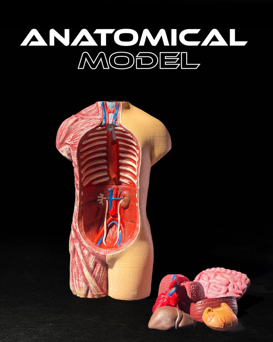 This anatomical torso model provides a clear and interactive way to study the structure of the human body. It includes detailed internal organs such as the heart, lungs, liver, stomach, intestines, and kidneys, which can be removed and reassembled for hands-on learning.