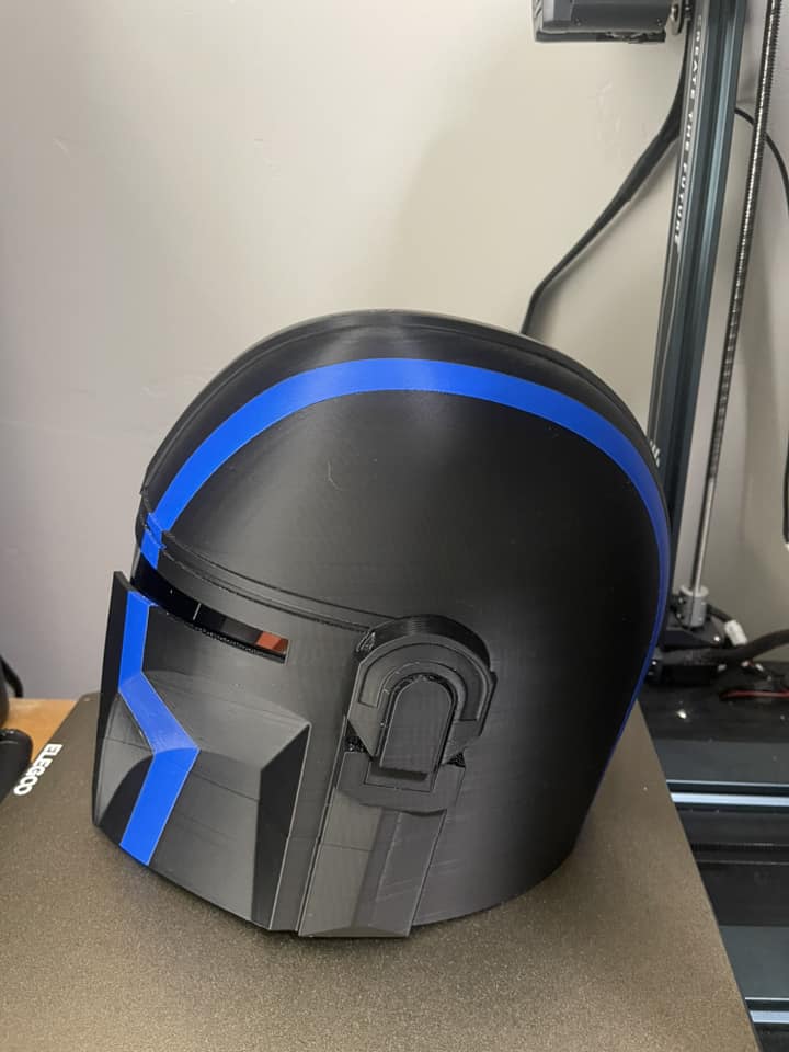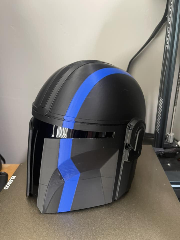 3D printed Mandalorian helmet featuring a thin blue line. This particular helmet came has the custom text “We’ll fight them together” on the the side. This can be taken off, or other custom text can be addded. This helmet is sized approximately the same as a medium to large motorcycle helmet. It includes a tinted visor.