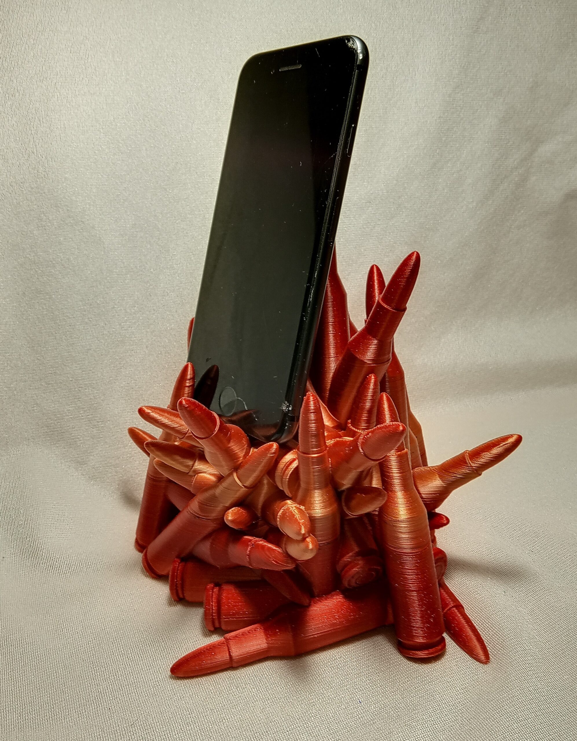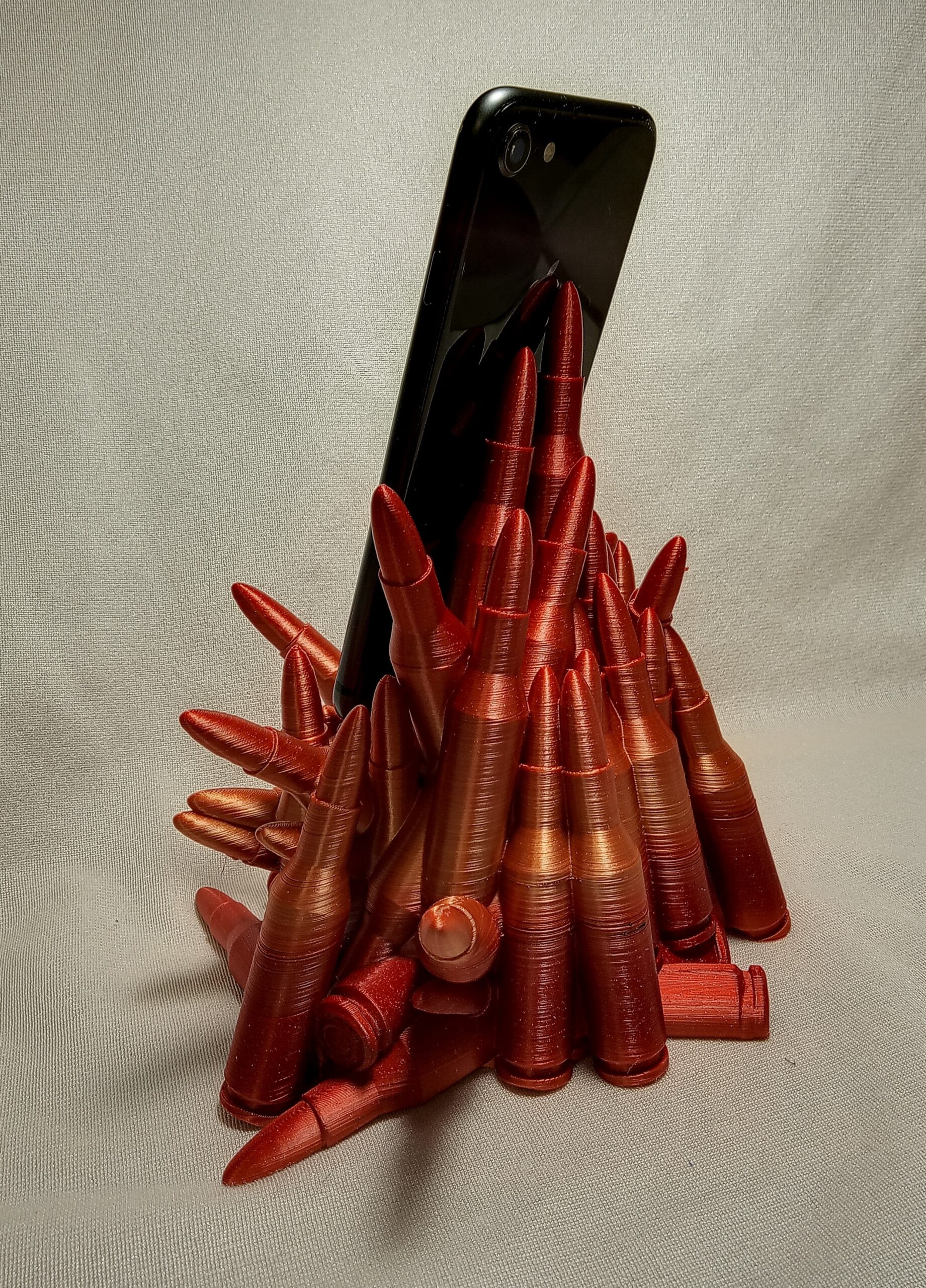 Put your phone on this pile of ammo. Has opening for cord. Printed in Red/Gold filament