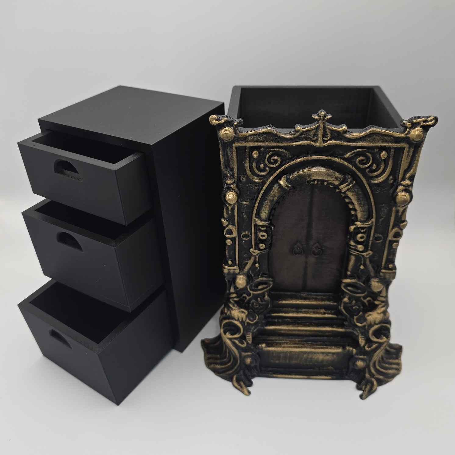 Jewelry Tinker Box by Oxi Studios, dry brushed to bring out the details. Drawers slide into the frame and out of sight. Measurements: 15cm (5.9″) high by 12cm (4.7″).