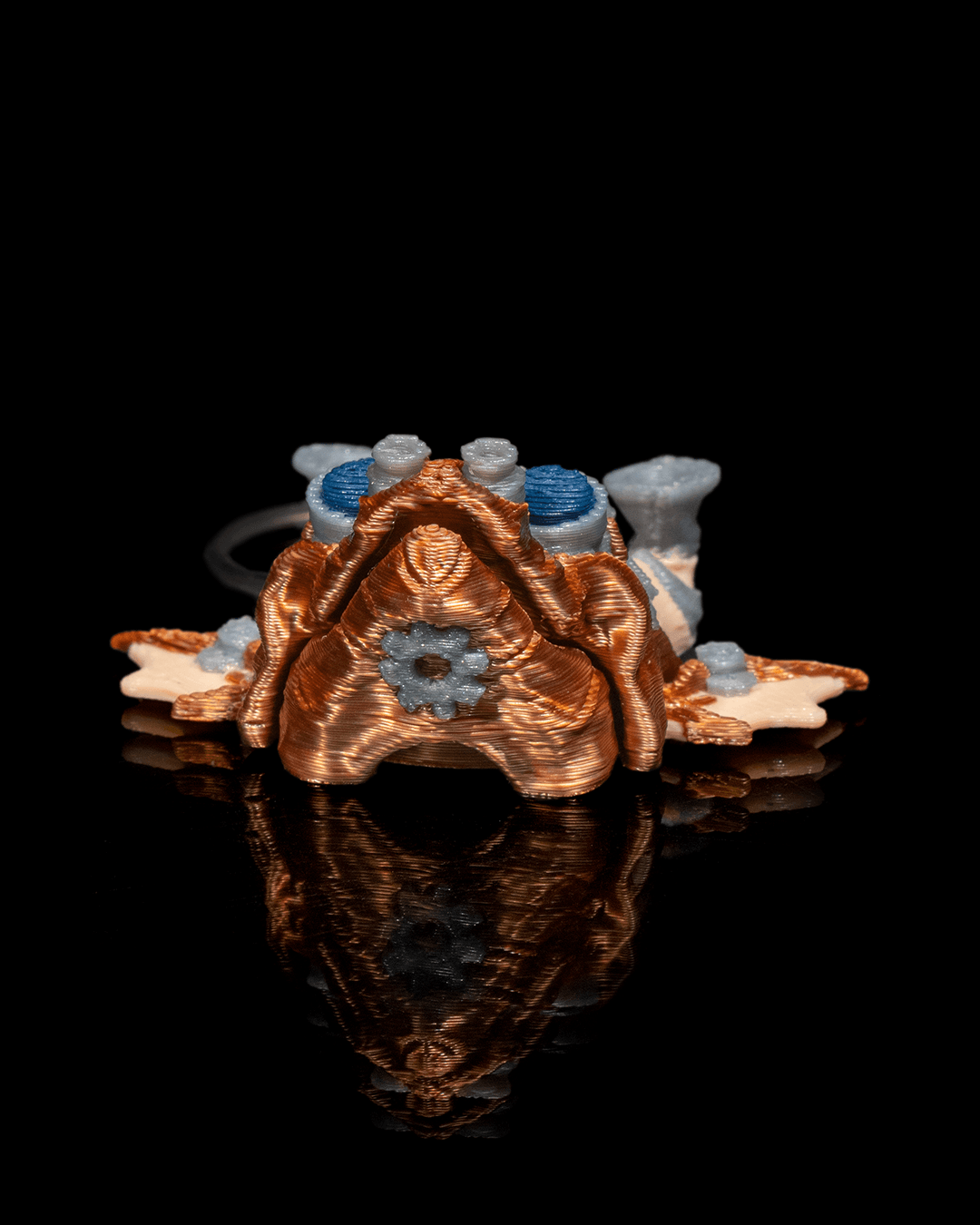The image features a keychain with a design that resembles a stylized, artistic representation of a creature’s head. The head has prominent horn-like structures and is adorned with blue circular patterns that could be interpreted as eyes or decorative elements. Above the keychain, there is stylized text that reads “Meka Jikan,” which may indicate the name of the design or brand associated with the keychain.