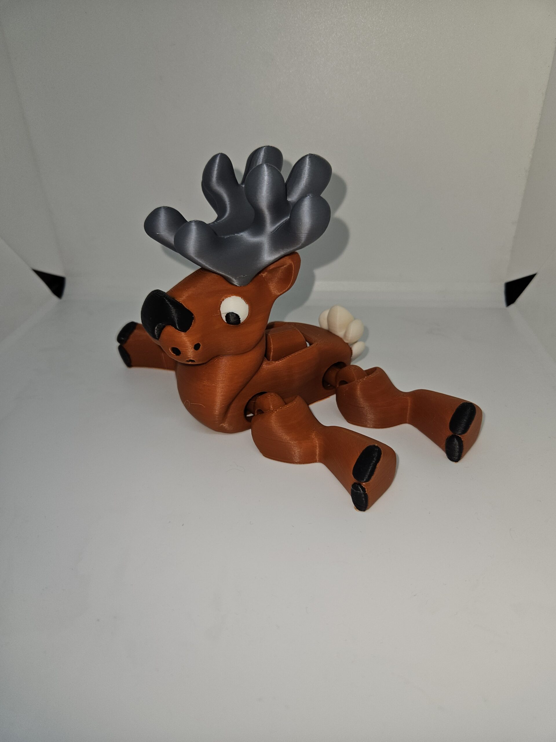 Comes in brown with silver antlers, white eyes and black trim details