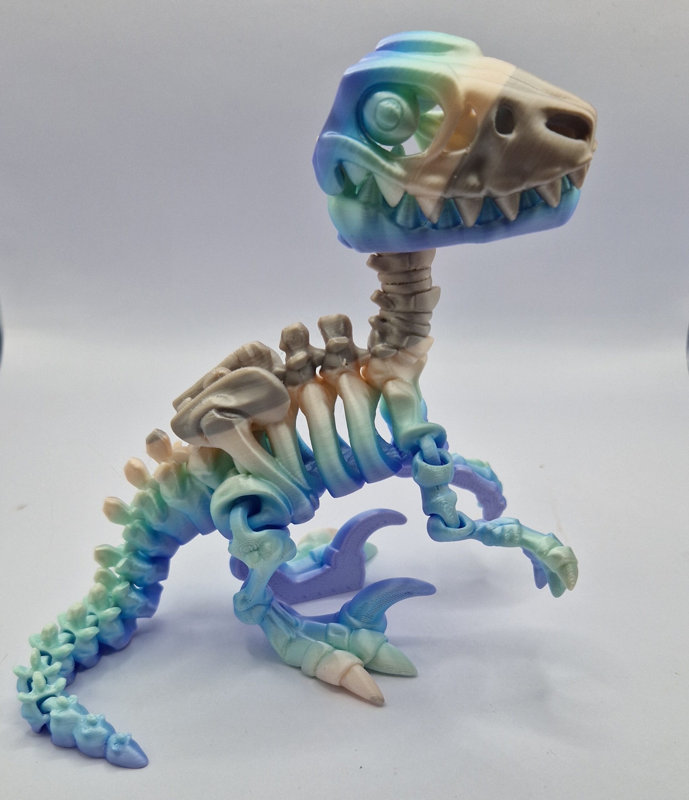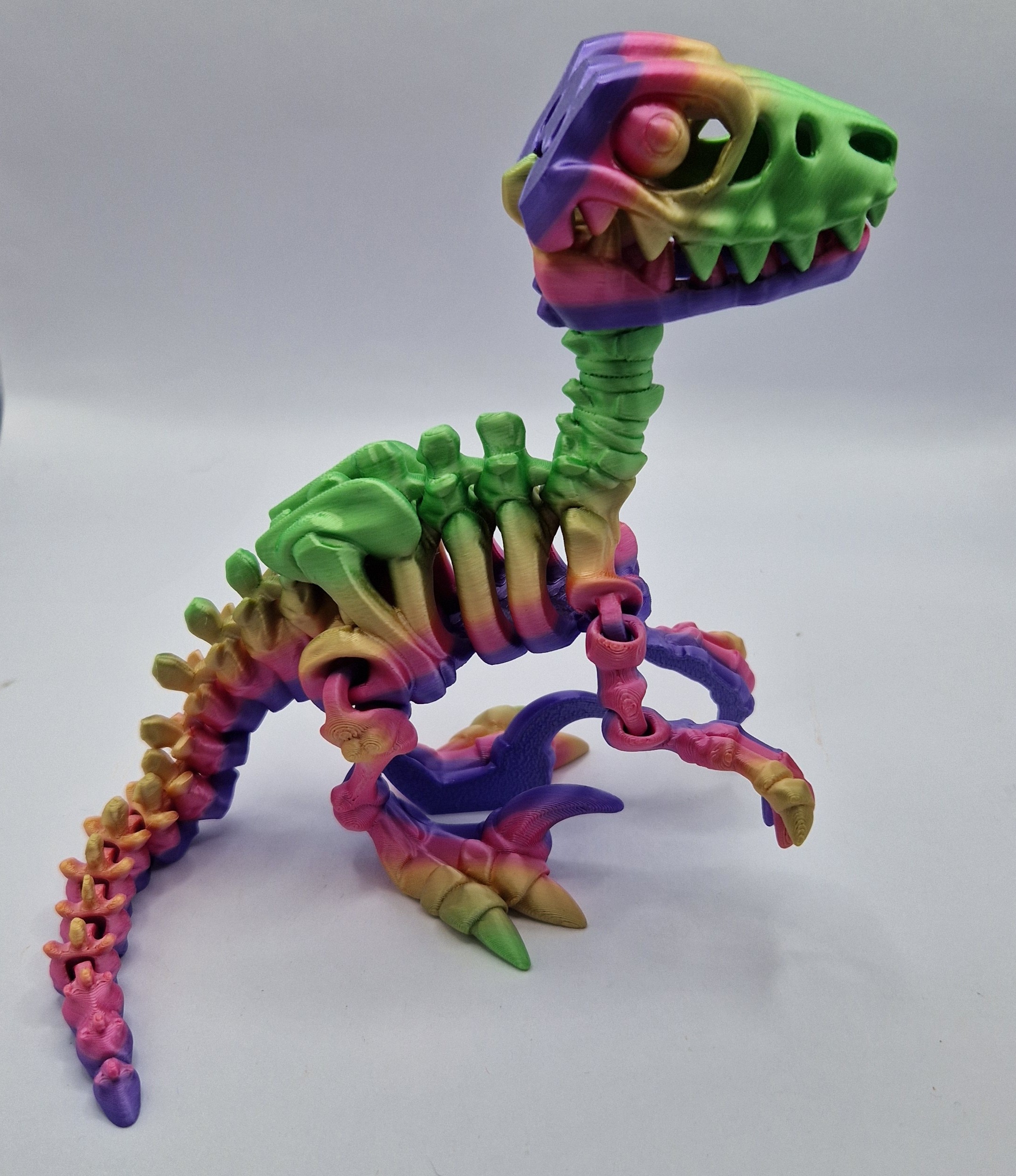 Introducing a marvel of 3D printing technology, our articulated raptor skeleton is an exquisite piece of art. Intricately designed with excellent precision, this lifelike model can be disassembled for closer study of the bones. Whether displayed in a museum, educational institution or as a stunning centerpiece, this skeleton adds a unique touch to any decor. Made from durable and eco-friendly materials, it is a smart alternative to traditional fossil collections. A perfect gift for paleontologists and dinosaur enthusiasts, this raptor skeleton is sure to impress. Buy it now and add an impressive addition to your collection!