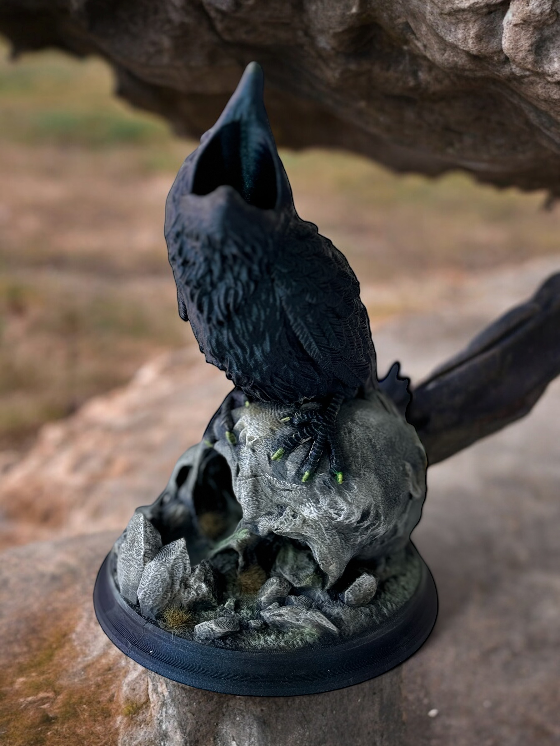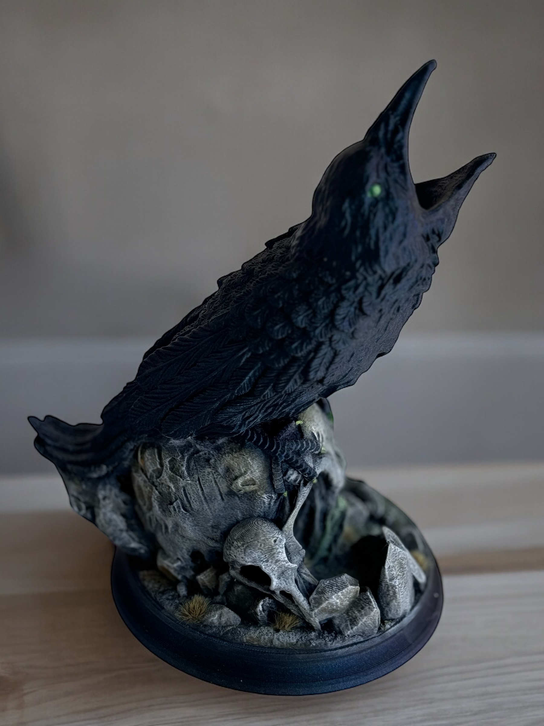 Beautiful shimmering and shifting colors Raven, skulls are hand painted and has some grassy decorations.