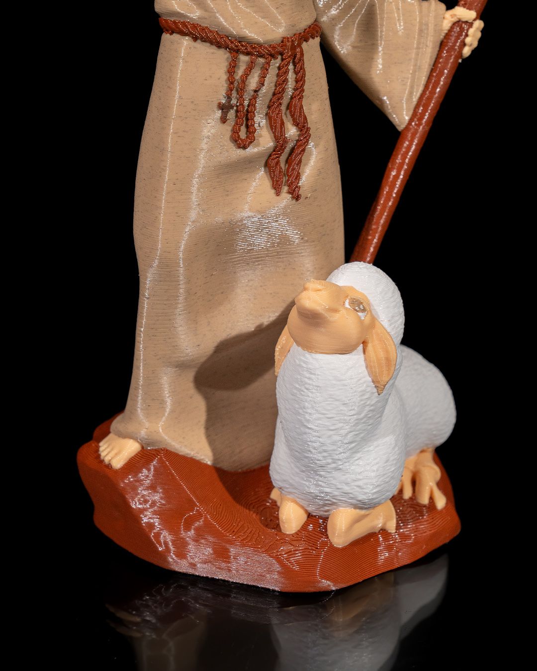 Esta estátua de 20 cm representa com riqueza de detalhes São Francisco de Assis, o padroeiro dos animais e da ecologia. A peça captura a essência do santo em um momento de conexão divina, segurando uma pomba branca em uma das mãos e acompanhado por um cordeiro aos seus pés, símbolos de paz e humildade.