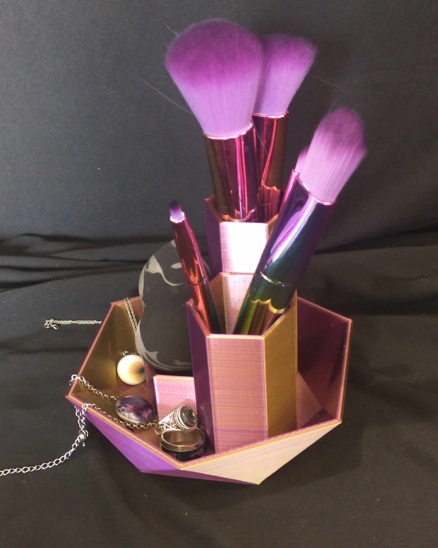 Organisez votre bureau ou votre salle de bain avec cet organisateur composé de trois hexagones intégrés dans une soucoupe ! Ce design astucieux permet de ranger vos accessoires, fournitures ou essentiels sans les mélanger, tout en gardant tout à portée de main. La soucoupe ajoute une touche d’élégance et de fonctionnalité, correspondant aux petits objets de se perdre.