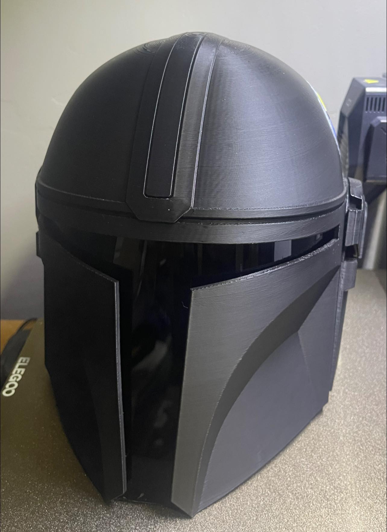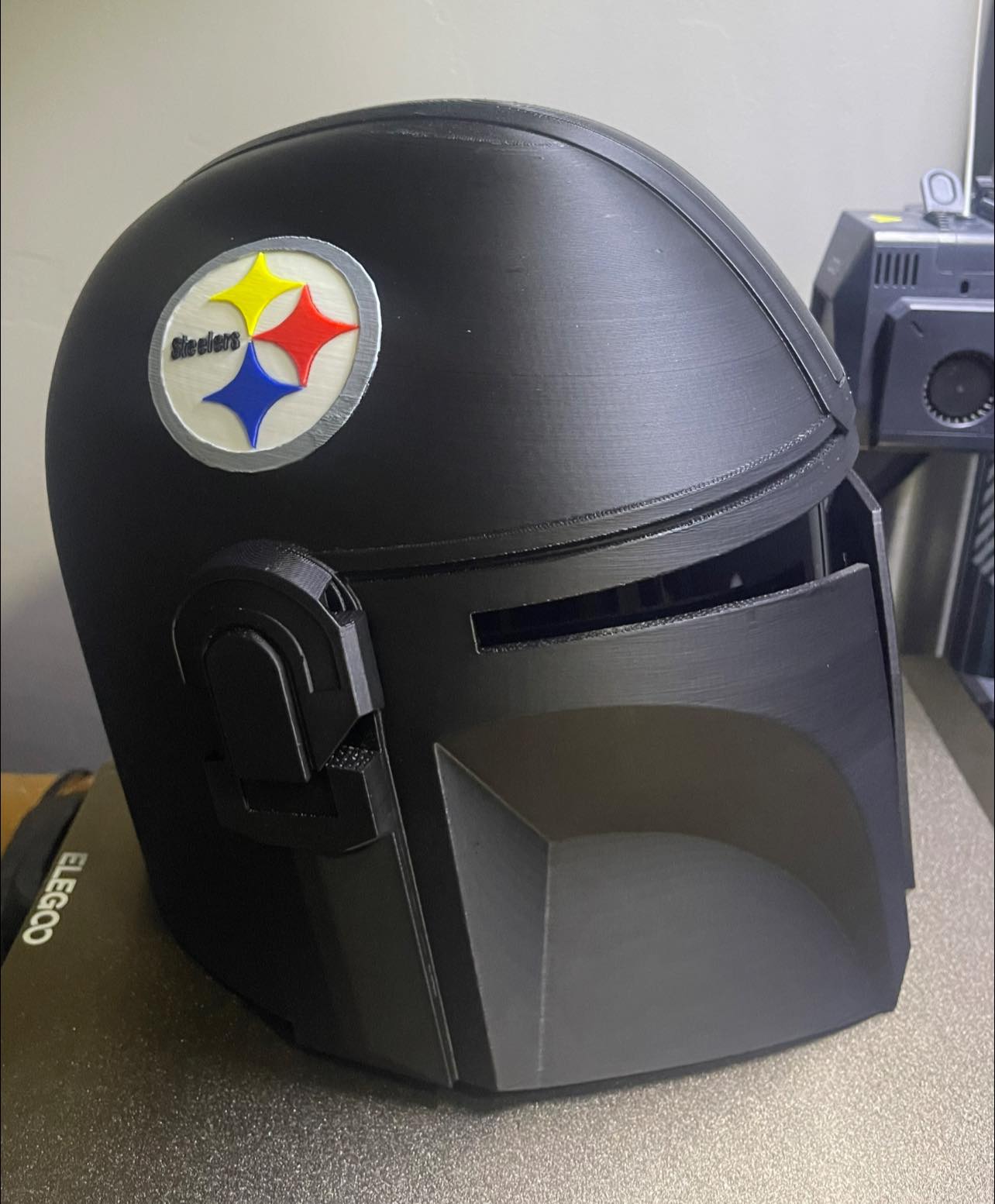3D printed Mandalorian helmet with a circle and stars on both sides. This helmet is sized approximately the same as a medium to large motorcycle helmet. It includes a tinted visor.