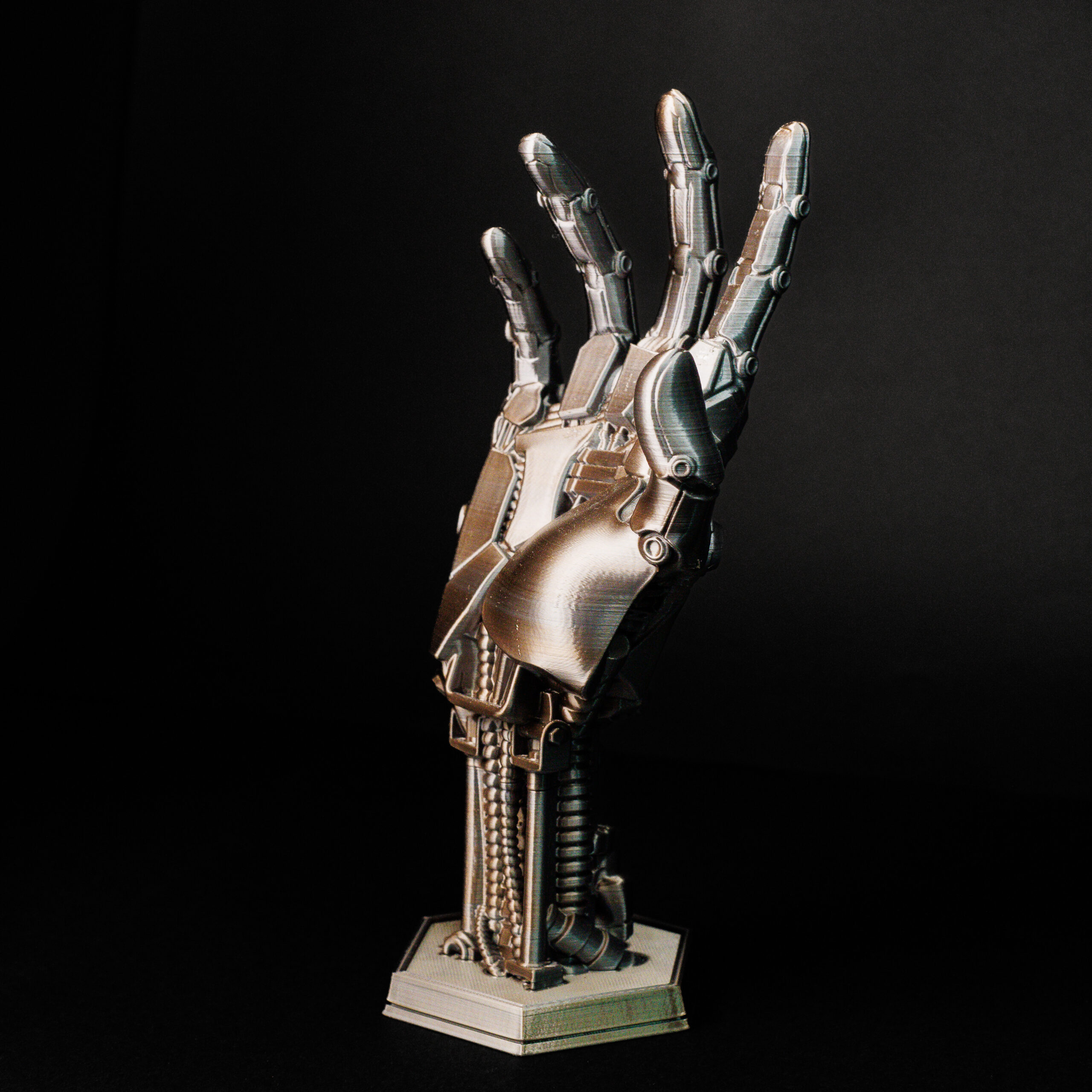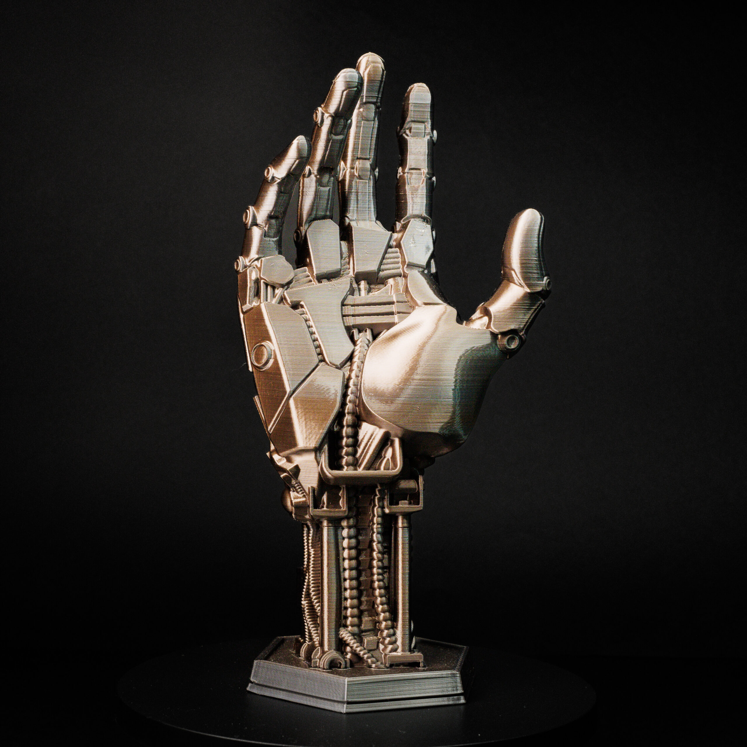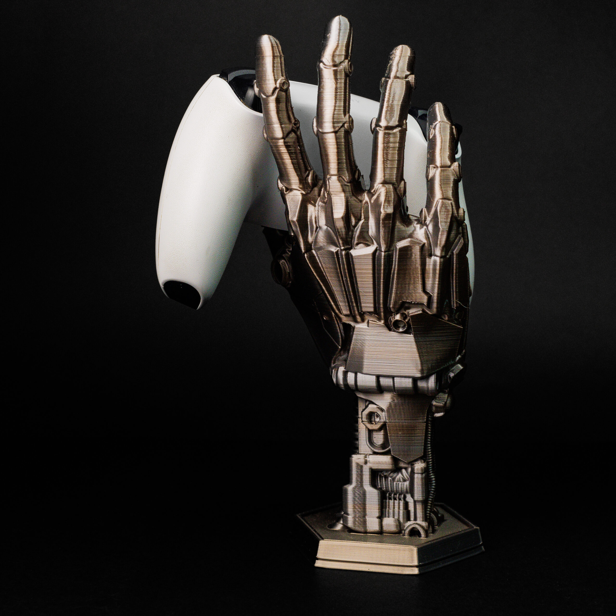 A forma de mão robótica, com detalhes metálicos e acabamento interno macio, protege seus controles enquanto os mantém organizados. As articulações realistas dão vida à peça, tornando-a uma verdadeira obra-prima decorativa no estilo cyberpunk. É funcionalidade e beleza em perfeita harmonia.
