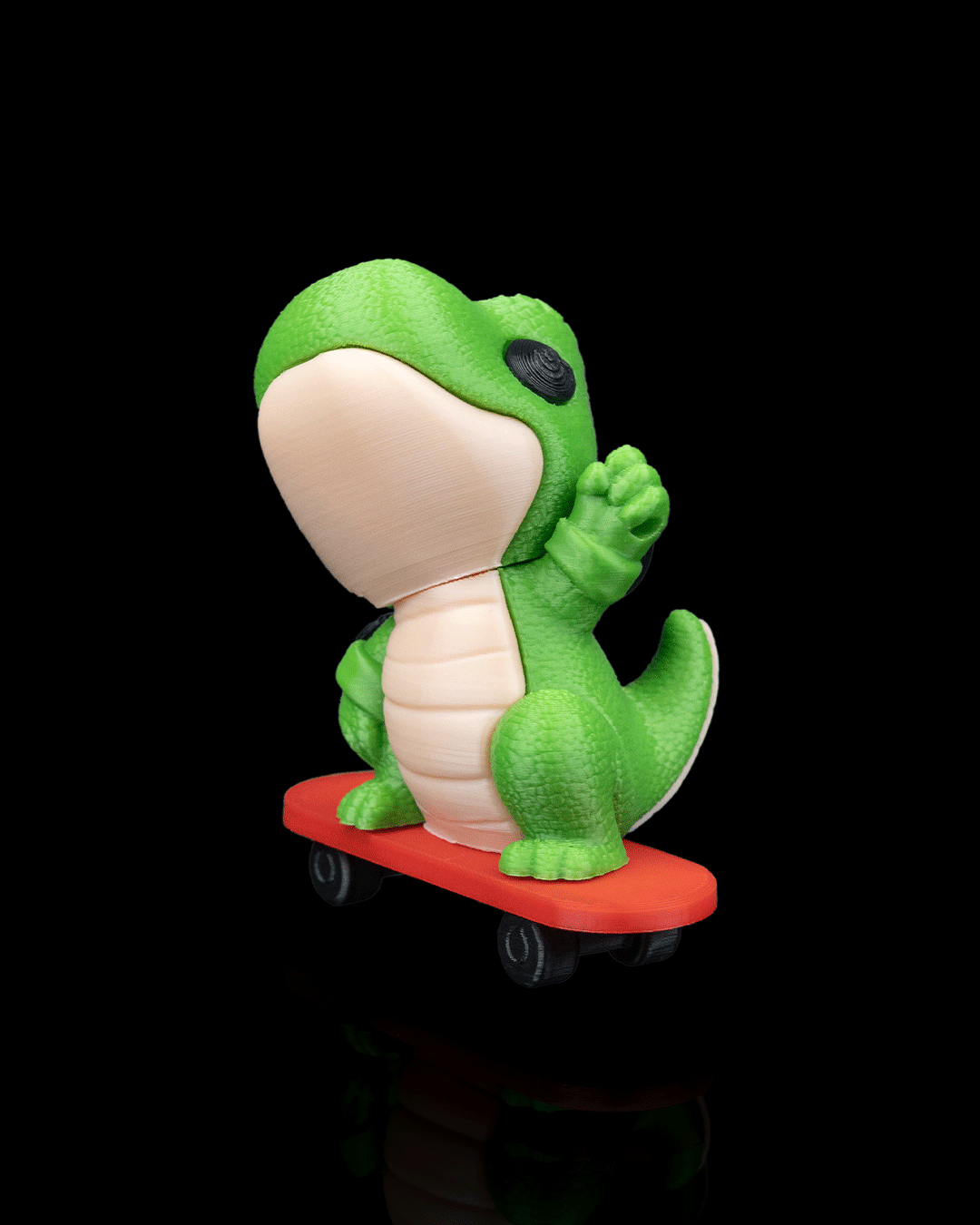 Fine 3D print layer lines are visible upon close inspection, contributing to a handcrafted feel. Details such as the dinosaur’s scales, facial features, and skateboard wheels are cleanly defined.