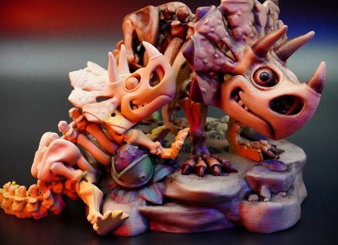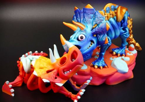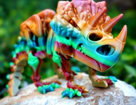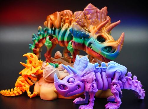 Apresentamos o impressionante esqueleto de Tricerátopo impresso em 3D, uma obra que captura a força e imponência desse icônico herbívoro pré-histórico. Com seus três chifres característicos e a grande gola óssea, cada osso foi recriado com precisão, exibindo sua estrutura poderosa e detalhada, desde o robusto crânio até suas patas firmes. A versão sem olhos destaca ainda mais o aspecto enigmático e antigo, remetendo a uma relíquia fossilizada, imersa em mistério e história.